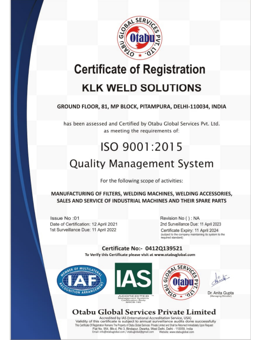 KLK WELD SOLUTIONS is an ISO 9001:2015 Certified